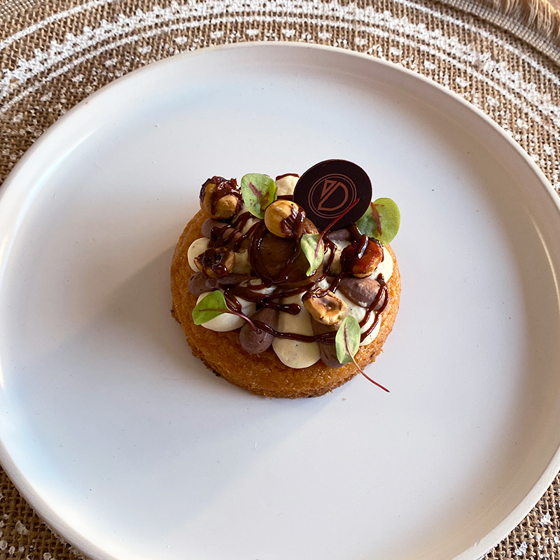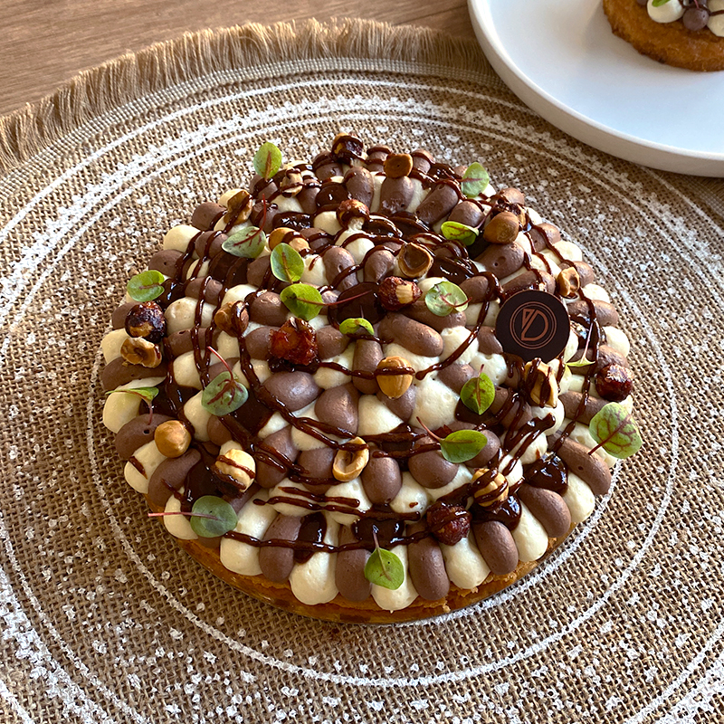 Composition : Ganache chocolat noir, crémeux praliné noisettes, crème légère vanille, sablé breton, praliné amandes/noisettes.ALLERGÈNES :