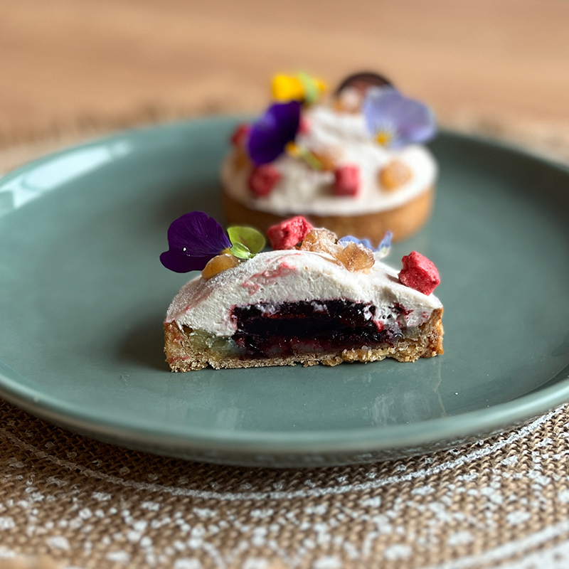 Pâte sablée aux amandes, crème légère aux marrons et confit cassisALLERGÈNES :