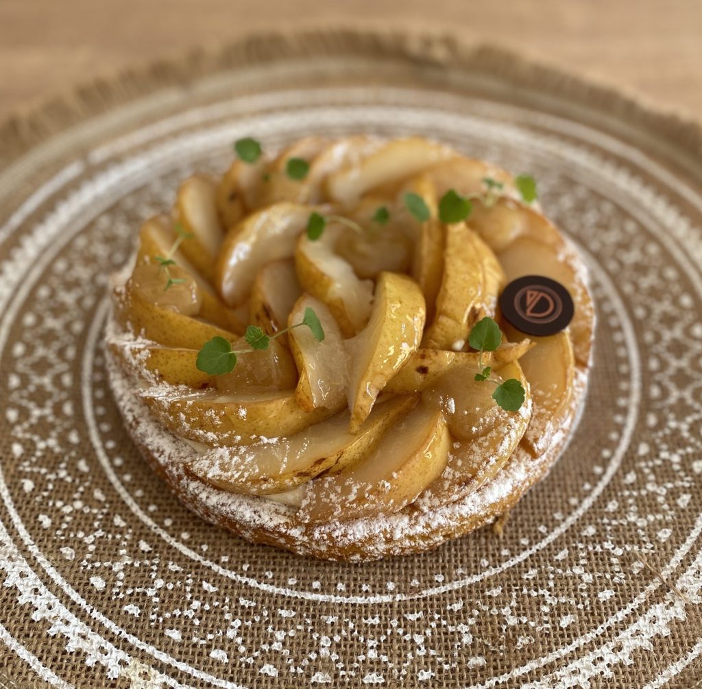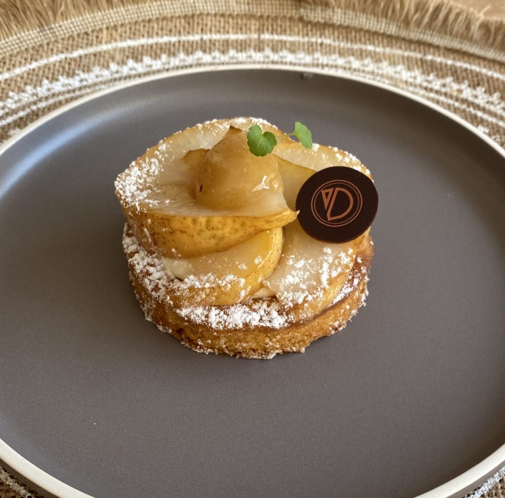 sablé breton, crème légère à la vanille de Tahiti, compotée de poires, poires fraîches mayennaisesALLERGÈNES :